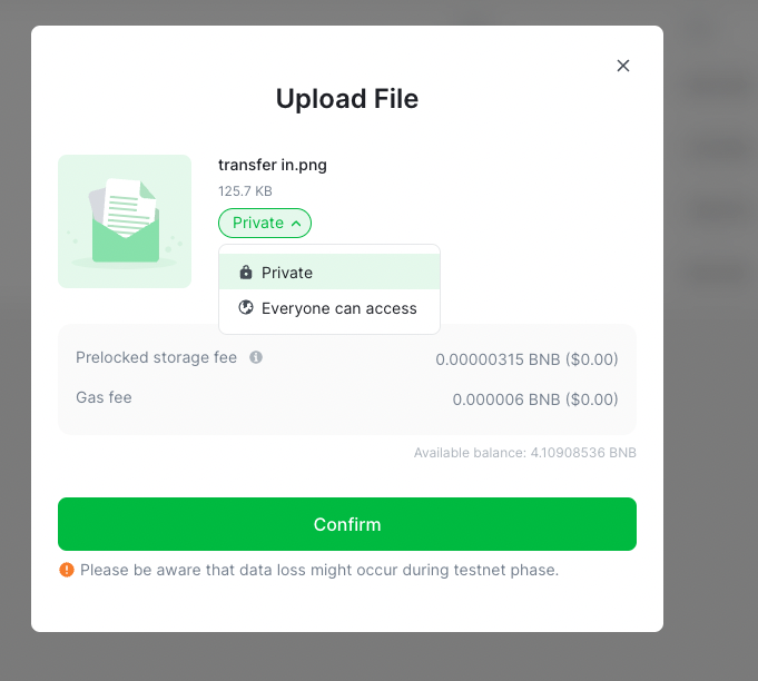 Besides, once your object is uploaded successfully, you will be charging a storage fee under a certain flow rate. Learn more about storage fee at Greenfield Doc.